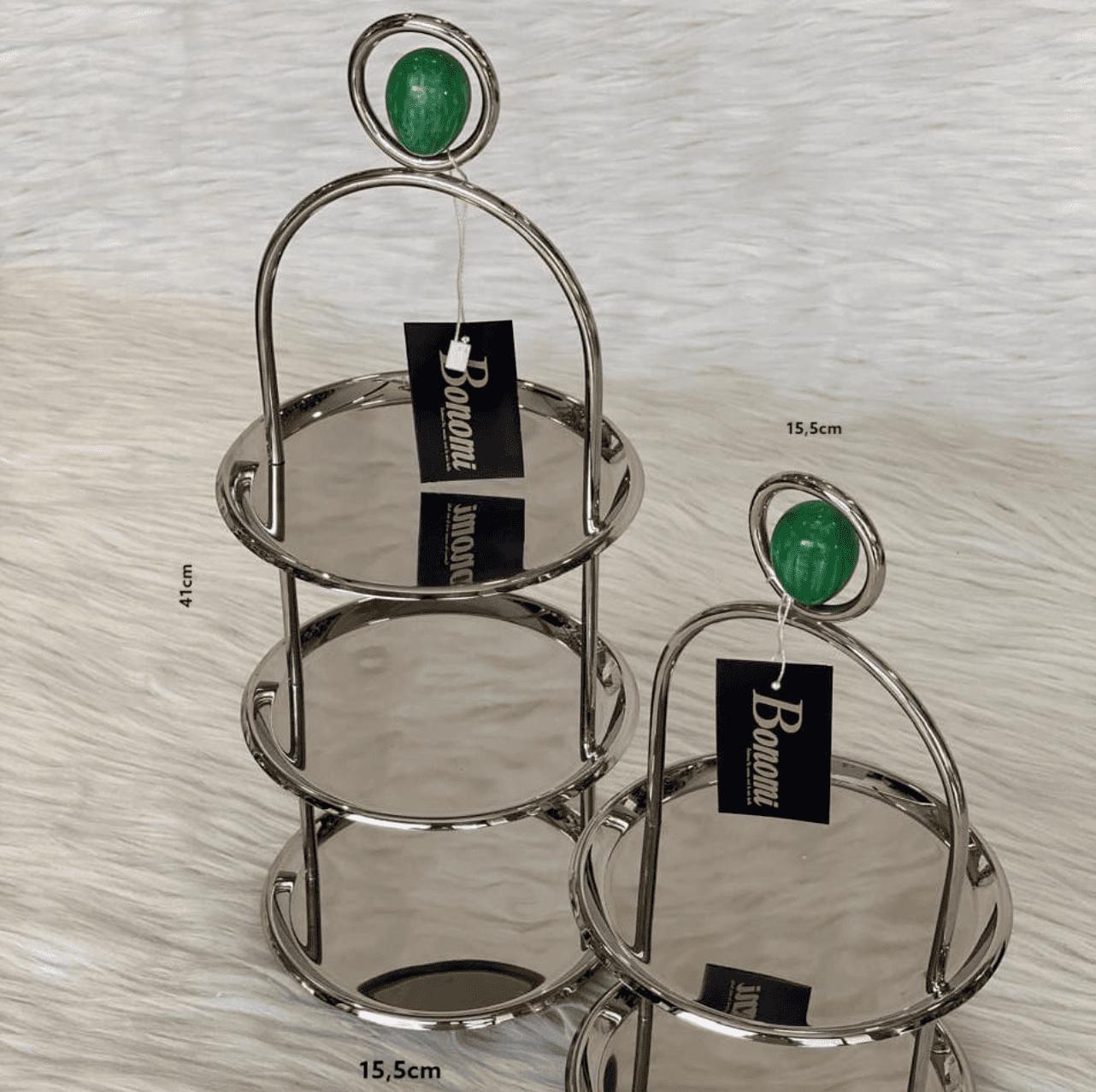 Sublimez vos réceptions avec le somptueux Présentoir à Gâteaux 3 Étages Bonomi, notre collection ‘Prestige Émeraude’. Ce dessertoir élégant mesure 41 cm de hauteur. Nous le fabriquons en Inox de haute qualité (acier inoxydable) avec une finition poli miroir impeccable. Cette conception garantit une brillance exceptionnelle et une résistance durable.