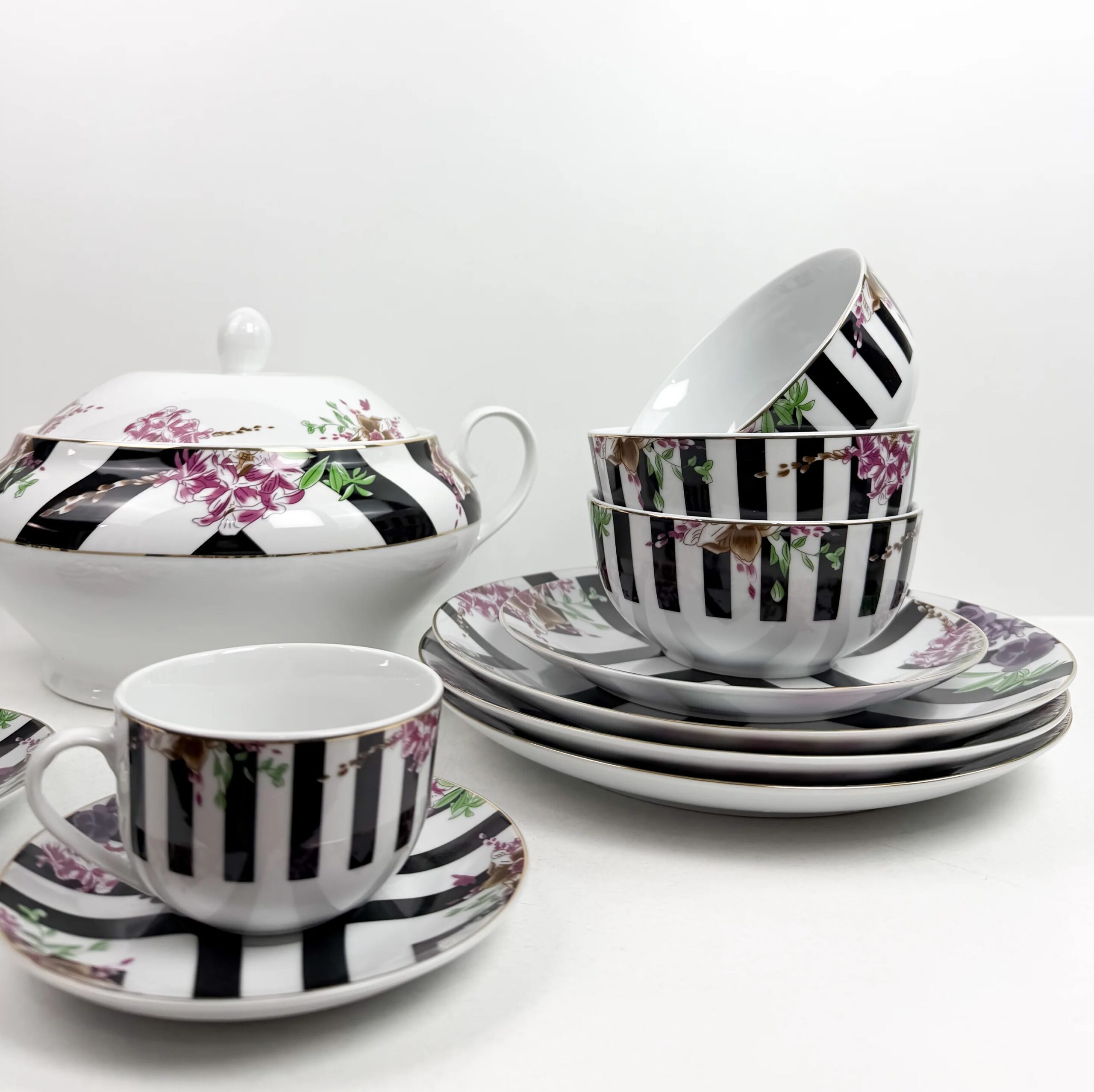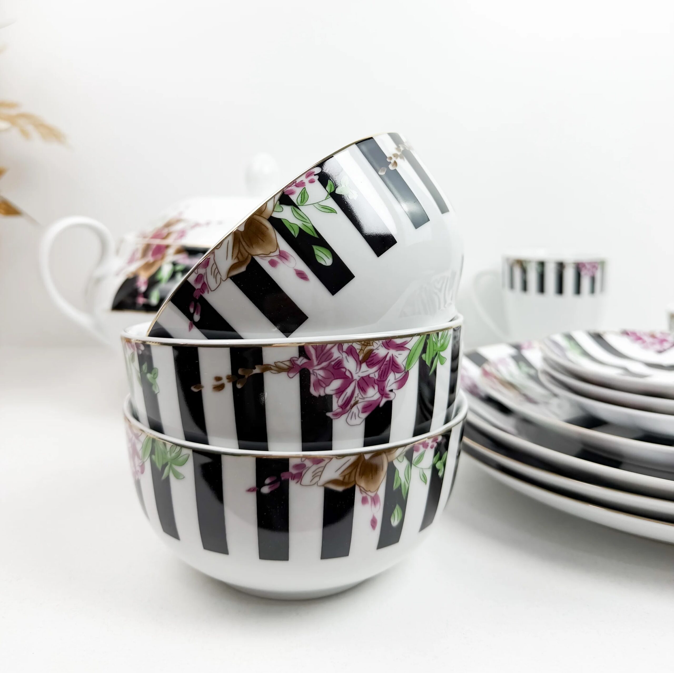 Apportez une touche de délicatesse et de raffinement à vos repas avec ce magnifique Service de Table Florale Rayée – 38 Pièces . Fabriqué en porcelaine de haute qualité, ce set est idéal pour embellir vos tables, que ce soit au quotidien ou pour des occasions spéciales.