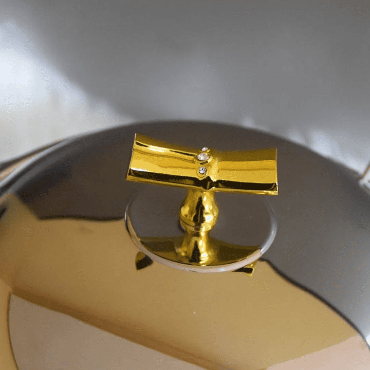 Cette soupière ne se contente pas de servir, elle décore. Ses finitions dorées éclatantes et ses détails ciselés sur les poignées rappellent le luxe des palais marocains. Les incrustations de cristaux sur le couvercle et les anses ajoutent un éclat incomparable sous les lumières de votre salle à manger.