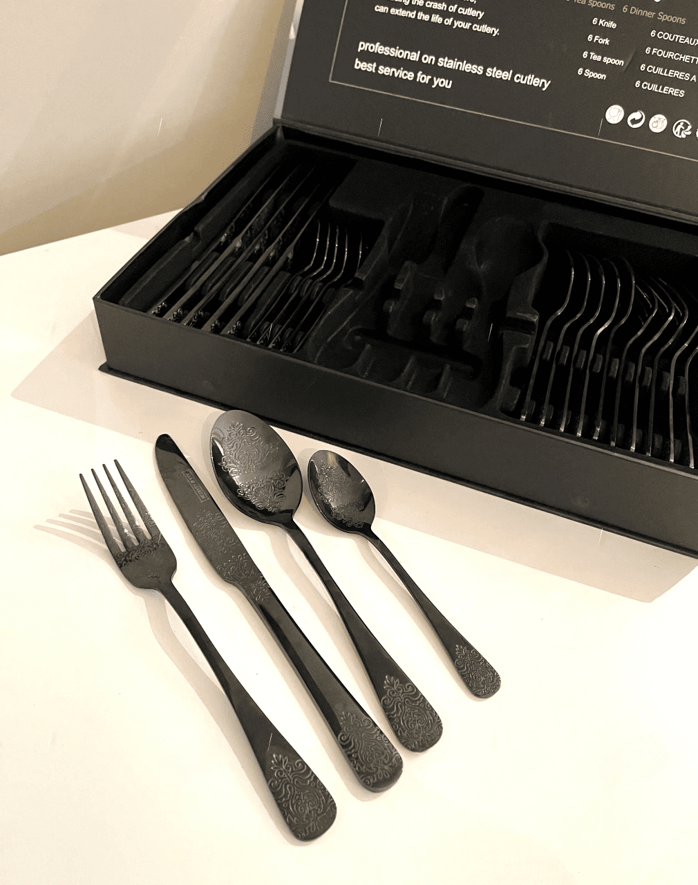 Ménagère de 24 pièces en Noir au Motif Élégant